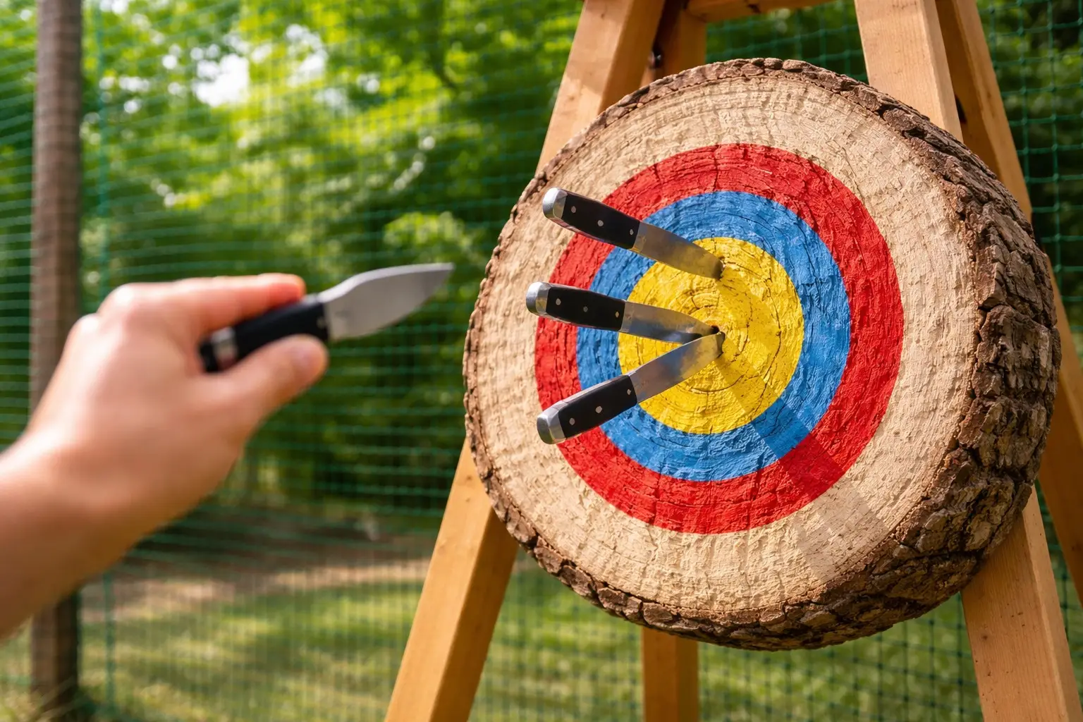 - Profesionální vybavení: Používáme vyvážené vrhací nože z ušlechtilé oceli, které jsou navrženy pro maximální přesnost a odolnost.